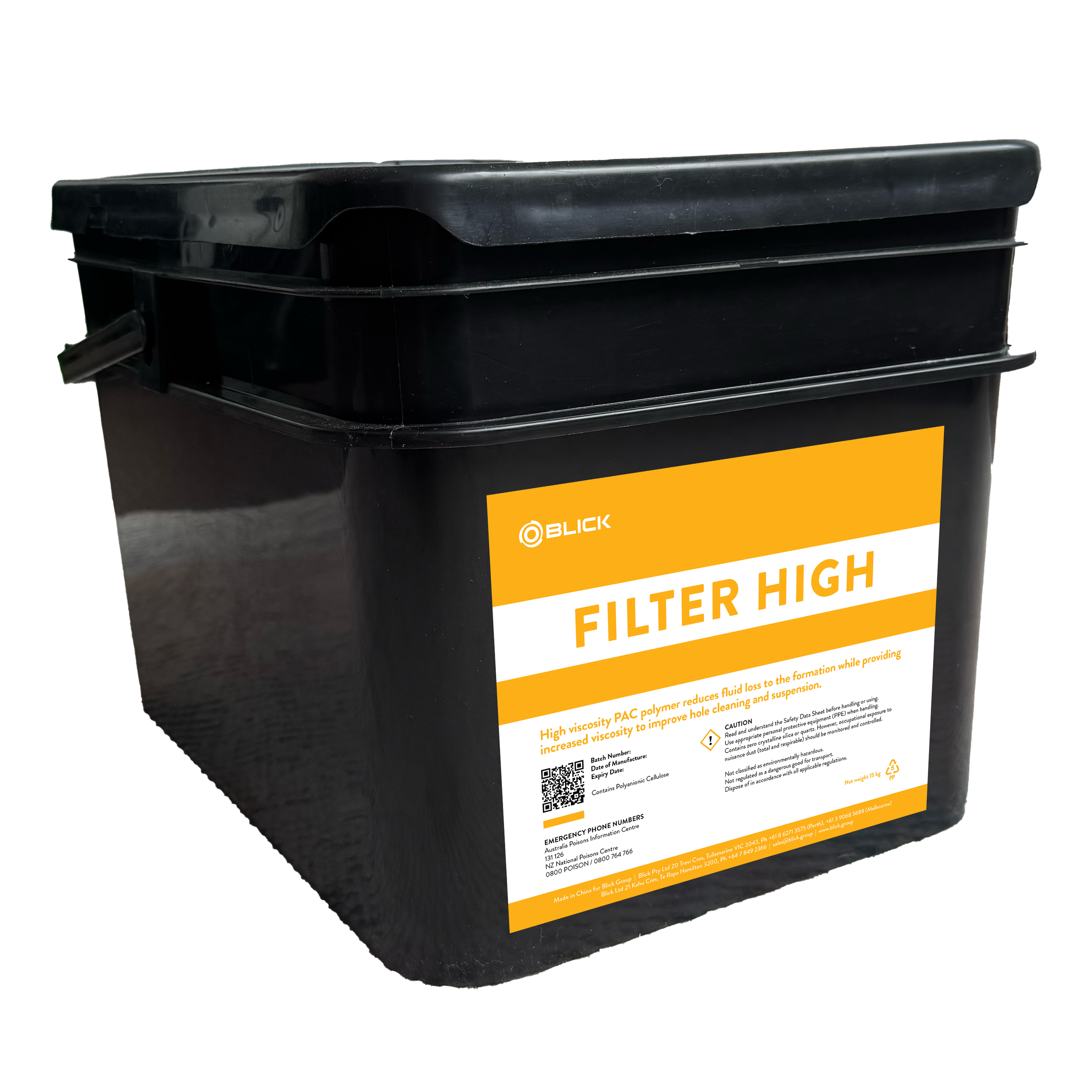 Filter High can be used in a bentonite-free system. It provides viscosity, reduces fluid loss, stabilises reactive shales, and enhances lubrication. It forms a thin filter cake and reduces cutting settling.