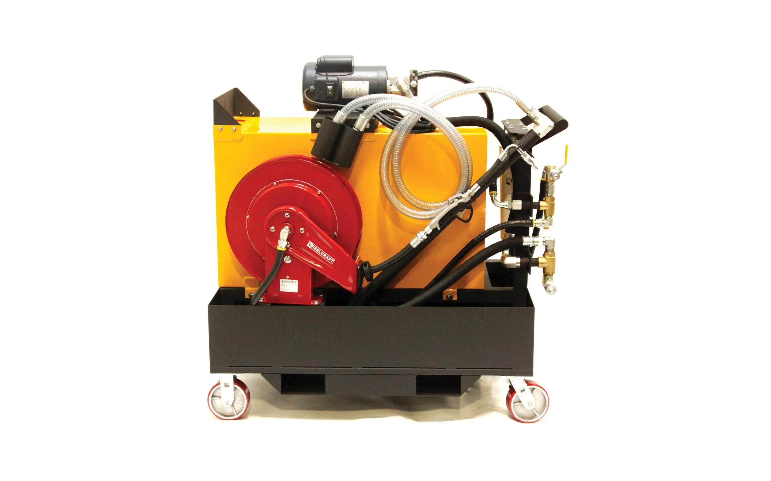 A mobile fluid storage, filtration and transfer cart. Includes all the features of the Fluid Handling Skid and adds a hose dispensary reel and suction wands. All in a small tidy package.
